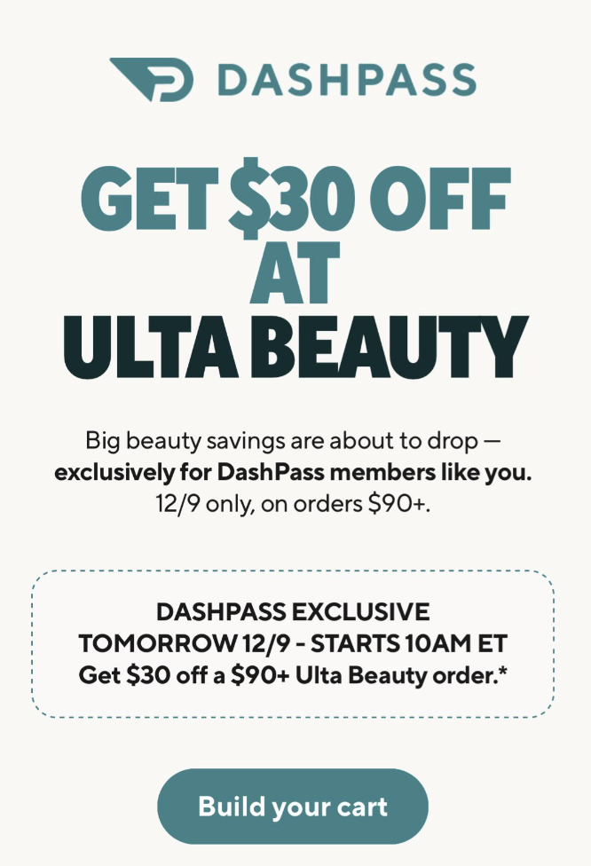 If you have Dashpass, today only, while supplies last, you can get $30 off a $90 order at Ulta.
