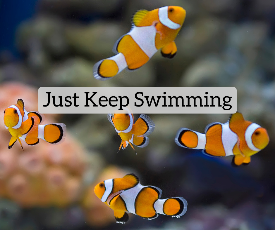 One of my favorite Disney lines comes from the movie Finding Nemo. When Nemo, a child clownfish who is lost in the ocean, meets Dory, a fish with short-term amnesia (cue the neurologists), she tries to encourage him when he is down and lost by telling him to “just keep swimming.” It’s better if you say it with a sing-song voice like Dory does!