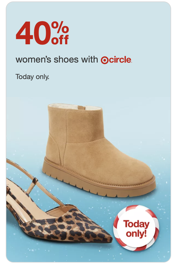 Another sale running today only- 12/19- is 40% off women’s shoes at Target.  There are winter boots, heels, sneakers and more…
